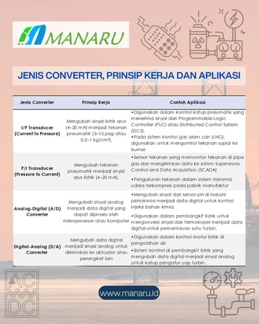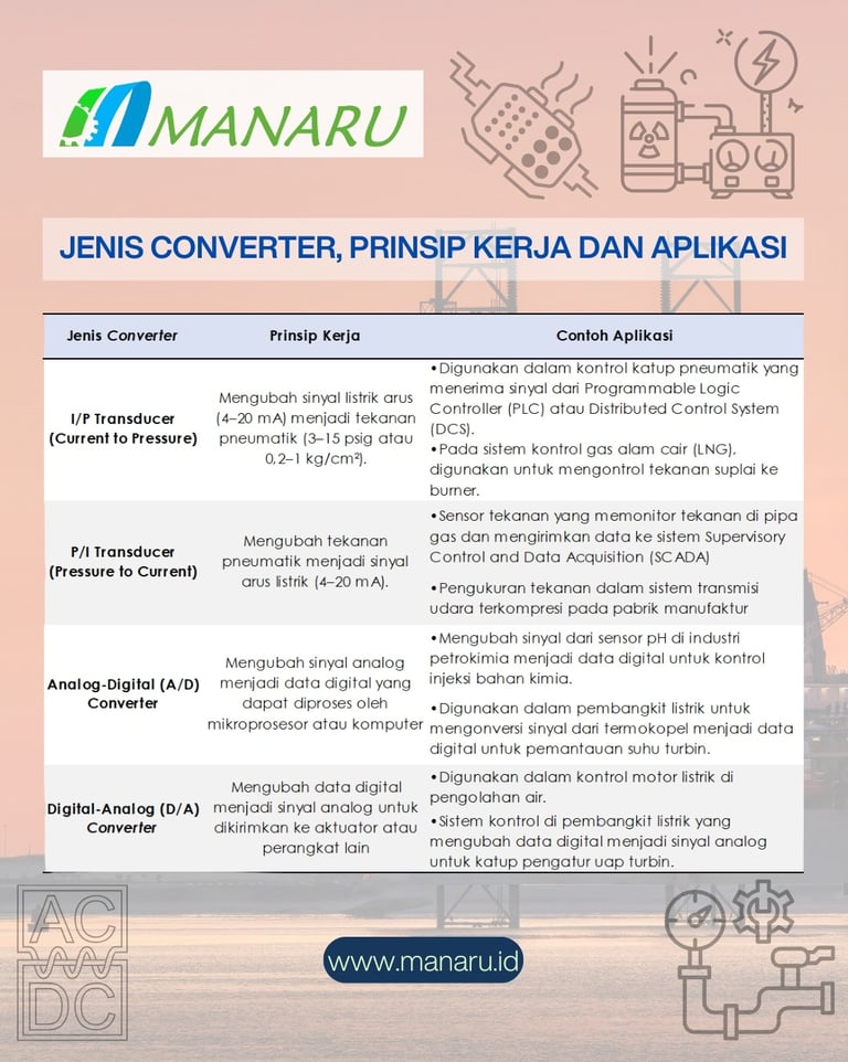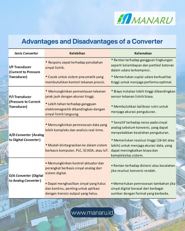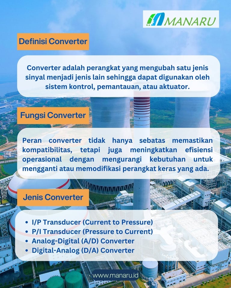 Converter adalah perangkat yang mengubah satu jenis sinyal menjadi jenis lain sehingga dapat digunakan oleh sistem kontrol, pemantauan, atau aktuator. Misalnya, dalam sistem kontrol berbasis pneumatik, sinyal listrik dari pengontrol harus dikonversi menjadi tekanan udara sebelum dapat menggerakkan aktuator katup. Begitu pula, sensor tekanan yang menghasilkan sinyal pneumatik perlu dikonversi menjadi sinyal listrik agar dapat diinterpretasikan oleh sistem digital. Dengan adanya converter, transisi antara berbagai bentuk sinyal dapat dilakukan dengan presisi tinggi, memastikan bahwa data yang dikirim dan diterima tetap akurat dan dapat diandalkan.