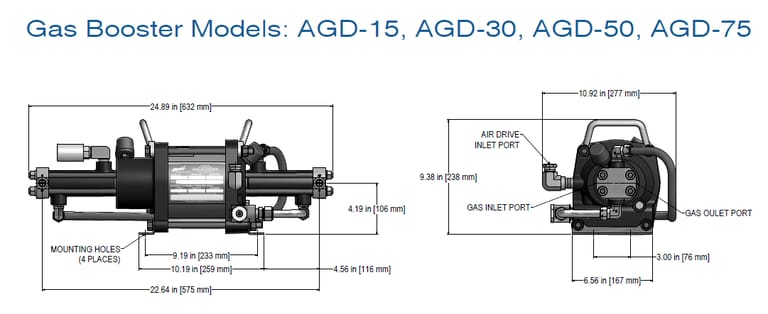 The Haskel AGD-30 is a double-acting, single-stage gas booster engineered to deliver efficient and reliable high-pressure gas boosting using only compressed air as the driving force. With a nominal pressure ratio of 30:1, this model is capable of achieving gas outlet pressures up to 9000 psig, making it suitable for a wide range of industrial, testing, and pressure-charging applications. Its pneumatic-driven design eliminates electrical requirements and ensures safe operation in hazardous or remote environments.