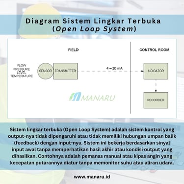 Pada sistem lingkar terbuka (open loop system), monitoring dilakukan tanpa kemampuan kontrol otomatis. Sistem ini hanya mengukur dan menampilkan parameter fisik tanpa mekanisme untuk mengoreksi kondisi yang menyimpang dari target. Contoh sederhana dari aplikasi sistem lingkar terbuka adalah pemantauan level air pada tangki penyimpanan. Transmitter mengukur ketinggian air dan data tersebut ditampilkan melalui indicator atau recorder. Jika level air terlalu rendah, operator akan secara manual membuka katup untuk menambah air ke dalam tangki. Sistem ini cocok untuk aplikasi sederhana atau situasi di mana intervensi manual sudah cukup untuk menjaga proses tetap berjalan.