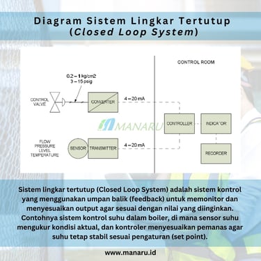 Sebaliknya, sistem lingkar tertutup (closed loop system) dirancang untuk tidak hanya memonitor, tetapi juga mengontrol parameter agar tetap sesuai dengan nilai target (set point) secara otomatis. Sistem ini menggunakan controller untuk membandingkan data aktual dengan set point, kemudian memberikan perintah kepada elemen kontrol, seperti control valve, untuk menyesuaikan proses. Contoh nyata aplikasi sistem lingkar tertutup adalah pada sistem pemanas air di boiler. Suhu air diukur oleh transmitter dan data tersebut dikirim ke controller. Jika suhu aktual lebih rendah dari set point, controller akan menginstruksikan control valve untuk meningkatkan aliran bahan bakar ke burner, sehingga suhu naik ke tingkat yang diinginkan. Sistem ini sangat penting untuk aplikasi yang membutuhkan stabilitas, presisi tinggi, dan respons cepat terhadap perubahan kondisi proses.