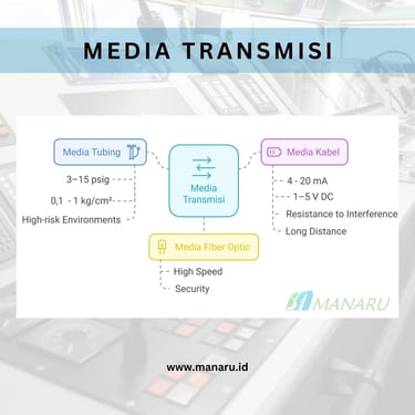 Pengiriman data (data transmisi) dalam industri dilakukan menggunakan berbagai media, yaitu tubing, kabel, dan serat optik (fiber optic). Setiap media memiliki prinsip kerja dan keunggulan yang berbeda sesuai dengan kebutuhan aplikasi. Berikut penjelasan lebih rinci: