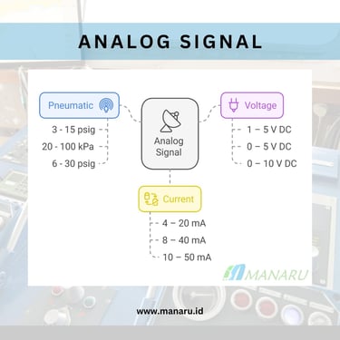 Sinyal analog yang umum digunakan meliputi sinyal pneumatik, yang beroperasi pada rentang tekanan 3 hingga 15 psig (0.2 – 1 kg/cm²), 20 hingga 100 kPa, atau 6 hingga 30 psig. Selain itu, sinyal analog juga bisa berbentuk tegangan, dengan variasi seperti 1 hingga 5 V DC, 0 hingga 5 V DC, atau 0 hingga 10 V DC. Sinyal arus juga banyak digunakan, dengan rentang yang meliputi 4 hingga 20 mA, 8 hingga 40 mA, atau 10 hingga 50 mA.