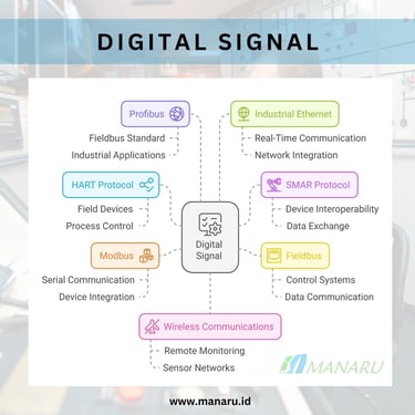Dalam perkembangan teknologi, banyak sistem kontrol kini menggunakan komunikasi digital dan perangkat komputer. Beberapa instrumen juga memanfaatkan komunikasi melalui sinyal radio atau serat optik. Misalnya, sensor suhu atau tekanan dalam sistem kontrol otomatis di pembangkit listrik sering menggunakan komunikasi digital melalui protokol seperti HART atau Modbus. Namun, jenis sinyal ini lebih spesifik dan tidak memiliki standar umum, karena sangat bergantung pada sistem unit elektronik yang digunakan, yang memberikan fleksibilitas dalam komunikasi data di industri modern.