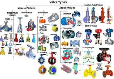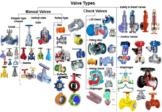 Terdapat berbagai jenis valve dan konfigurasi valve yang dirancang untuk melayani berbagai layanan dan kondisi. Valve ini digunakan untuk berbagai keperluan (on/off, kontrol), berbagai jenis fluida (cairan, gas, dll.; mudah terbakar, beracun, korosif, dll.), berbagai material, serta berbagai kondisi tekanan dan suhu. Valve digunakan untuk memulai atau menghentikan aliran, mengatur atau membatasi aliran, mencegah aliran balik, atau mengurangi dan mengatur tekanan dalam aplikasi penanganan fluida atau gas. Jenis valve yang umum meliputi: Ball, Butterfly, Check, Diaphragm, Gate, Globe, Knife Gate, Parallel Slide, Pinch, Piston, Plug, Sluice, dan lainnya. Berikut ini adalah beberapa jenis katup yang digunakan dalam berbagai aplikasi, yang dapat menjadi panduan dasar dalam pemilihan katup.