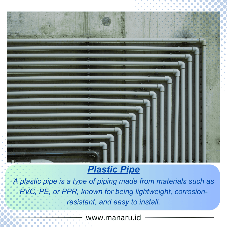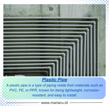 Plastik seperti PVC, CPVC, PTFE, dan PVDF : Material pipa yang sering digunakan untuk menangani fluida korosif, terutama pada aplikasi dengan tekanan dan suhu rendah hingga menengah. Keunggulannya terletak pada ketahanan korosi yang baik, ringan, serta kemudahan dalam instalasi dan biaya yang lebih rendah dibandingkan material logam. Namun, kelemahan plastik teknik adalah keterbatasan dalam aplikasi suhu tinggi, karena material ini dapat mengalami penurunan kekuatan atau deformasi pada suhu ekstrem.