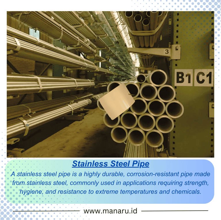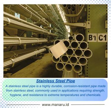 Baja tahan karat (stainless steel) : Material pipa stainless steel memiliki ketahanan korosi yang sangat baik, menjadikannya sebagai pilihan utama untuk aplikasi yang melibatkan bahan kimia korosif. Jenis stainless steel yang sangat populer di industri kimia yaitu SS304 dan SS316, memiliki daya tahan terhadap oksidasi dan korosi.