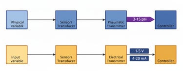 Pneumatic Transmitter berfungsi mengubah variabel proses seperti tekanan (pressure), aliran (flow), atau ketinggian cairan (liquid level) menjadi sinyal udara bertekanan dalam rentang 3–15 psig. Sinyal ini kemudian diteruskan ke controller, recorder, atau final control element (seperti valve actuator) untuk mengatur proses secara otomatis.